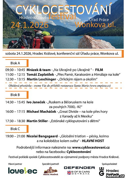 Hlavním programem bude projekce prvního dánského cyklocestovatele, který objel svět, Nicolaie Bangsgaarda o jeho globálním triatlonu – podruhé kolem světa, tentokráte na koloběžce, běžecky a na kole. Za tahák festivalu lze určitě považovat projekci cyklodobrodruha Michaela Macháčka o jeho přejezdu z Kanady až do Mexika po legendární trase Great Divide. Pro vrcholové nadšence je tu pak beseda Tomáše Zaplatílka, který vás protáhne na kole přes Karakorám, Himálaje i Pamír.