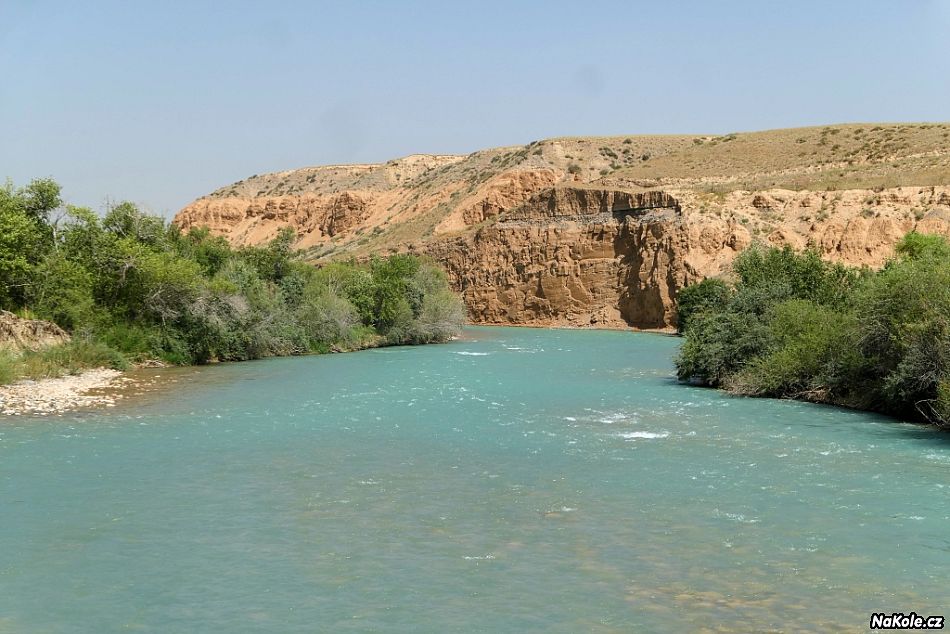 Ráno famózní příjezd do Narynu skrz soutěsku oranžových skal. Za Narynem podél řeky Naryn (alias Syrdarja, kterou určitě znáte z hodin zeměpisu!) jedna z nejpohodovějších etap. Celý den mírně z kopce až do 1600 m. Silnice skoro bez provozu. Vesnice minimálně po třiceti kilometrech. A příšerné horko.
