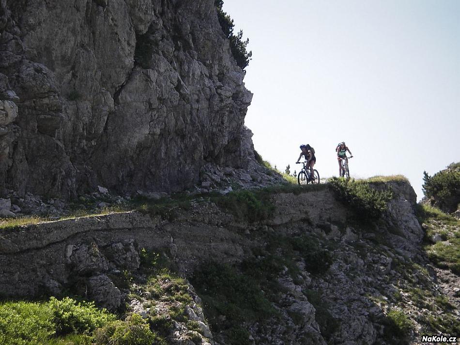 Poslední ráno stoupáme z Passubia na Palon s pozůstatky nesmyslné první světové. Okolo rakouských pozic se cesta ztrácí a babičky se zlobí, vyjadřují nespokojenost, dokonce by se chtěly podívat do mapy! Nakonec kola trochu poponesem a tak to v těch výškách celkem zvládáme. Odměnou je vzdušný hřebínek s výhledy někde od Brenty až k Drei Cime. Babičky jsou už zase šťastné.