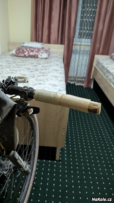 Opatrně jsem dojel k nejbližší silnici, kde byla i vesnice. Rychle se kolem mě shlukli místní a nabízeli pomoc. Jeden pán mi je „opravil" tak, že do nich zarazil dřevěnou tyč. Na první pohled to vypadalo funkčně, ale nechtěl jsem to riskovat a navíc mi chyběl jeden grip. Raději jsem si vzal taxík zpátky do Oše, kde se mi po pár pokusech podařilo najít obchod s koly – na mapách k nalezení nebyl, řekli mi o něm místní – a sehnal jsem náhradní řídítka značky Shunan.