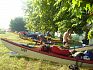 Stany máme postavené vedle pádlerů, kteří na mořských kajacích sjíždějí Dunaj. Jsou jich na tři desítky, podle vlaječek z různých koutů Evropy. Povětšině vodáci středních let. Někteří odplouvají časně ráno, jiní to nehrotí. Potkali jsme je ještě jednou - jejich doprovodné vozidlo s koordinátorem plavby, mluvili jsme s ním v recepci hotelu Plava Ruža. U obce Bačko Novo Selo zabydloval tábořiště. Za dva dny napádlovaly 80 km. Ukrutná dřina.