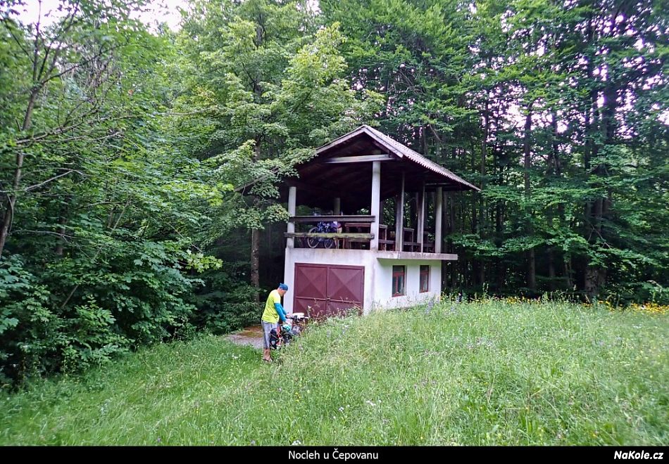 Po menší hádce, kdy jsme poblíž Čepovanu měli problém najít nocleh a on že 50 m od silnice (kde nikdo nejezdil) spát nebude, zvolil random nějakou odbočku do lesa, načež tam objevil parádní loveckou chajdu. Spolkla jsem v duchu všechny výčitky, proč jsme museli kola vláčet do prudkého kopce lesní cestou a musela vzdát hold jeho instinktu. Chatka byla zamčená, ale měla zvláštní patérko s jakýmisi stolky, které jsme identifikovali jako posedy pro myslivce. Kola jsme vytahali nahoru a patro obsadili. Postavily jsme si se Šárkou vnitřní stan, protože komáři. Luděk si ulehl jen tak a jak jsem psala, od této druhé noci svého rozhodnutí nevzít si stan celý, litoval. Vychytávka to byla skvělá ještě i proto, že v noci pršelo.