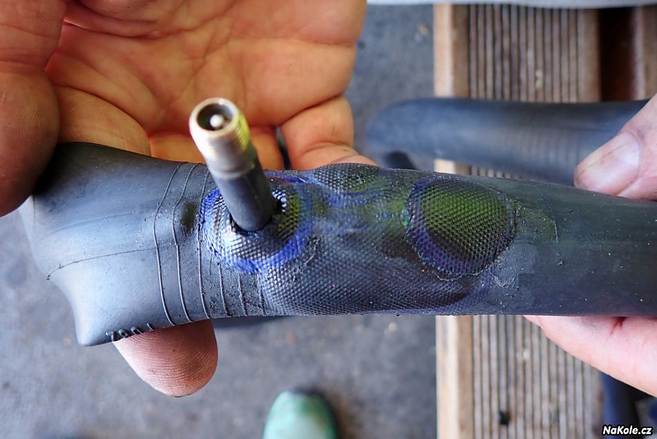 Jako poslední jsme vyzkoušeli metodu - do záplaty vystřihnout kulatou dírku a přes ventilek ji přetáhnout. To jakžtakž drželo, tak jsme mohli jet dál. Jen bohužel na ten Predjamský hrad nedošlo, zavíral v šest hodin.