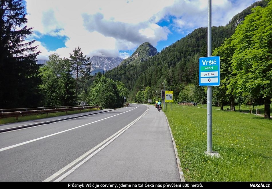 Po jídle mi to najednou došlo - já měla obyčejný hlad! Prostě jsme se ráno nasnídali jen lehce, co zbylo z večeře, s tím, že si někde dáme kávu. Jenže v Kranjské Goře nám všechny kavárny přišly příliš snobské a turistické a pak najednou konec a dál už nic nebylo. Jen cesta vzhůru do hor. A energie došla brzy. Po jídle jsem zbytek sedla zdolala - nechci říci jako hračku, ale jelo to podstatně lépe. Resp. jelo to a to mi v tuhle chvíli ke štěstí stačilo. Nemusela jsem odpočívat co 20-30 výškových metrů, zvládala jsem dávat pauzy až po padesáti. Sklon cesty je tak prudký, že proti i za mnou jedoucí auta nebo motorky musí jet skoro stejnou rychlostí, všichni jeli opatrně a předjížděli s respektem. Nikdo zbytečně nemachroval, netroubil ani netúroval motor. Neměla jsem tedy důvod nadávat.