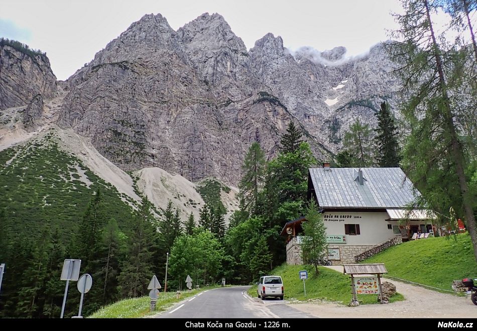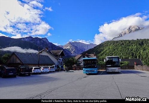 Cesta je v pohodě zvládnutelná za jeden den, pokud si zaplatíte rakouskou dálniční známku. Parkování jsme si vyhlédli už doma, malá obec Rateče v severozápadním cípu Slovinska, kousek od hranic s Itálií. Všude v okolí jsou parkoviště placená, v Rateče nikoli. Plán byl dorazit někdy v podvečer, napakovat kola a na nocleh už na nich kousek popojet. Realita: Cestou přes poslední sedlo Wurzen Pass (1072 m) se silně rozpršelo a vypadalo to, že nepřestane až do rána. Než bychom vše naložili na kola, byli bychom kompletně durch. Z auta se člověku do deště prostě nechce :-) a tak jsme výjezd odložili na ráno.