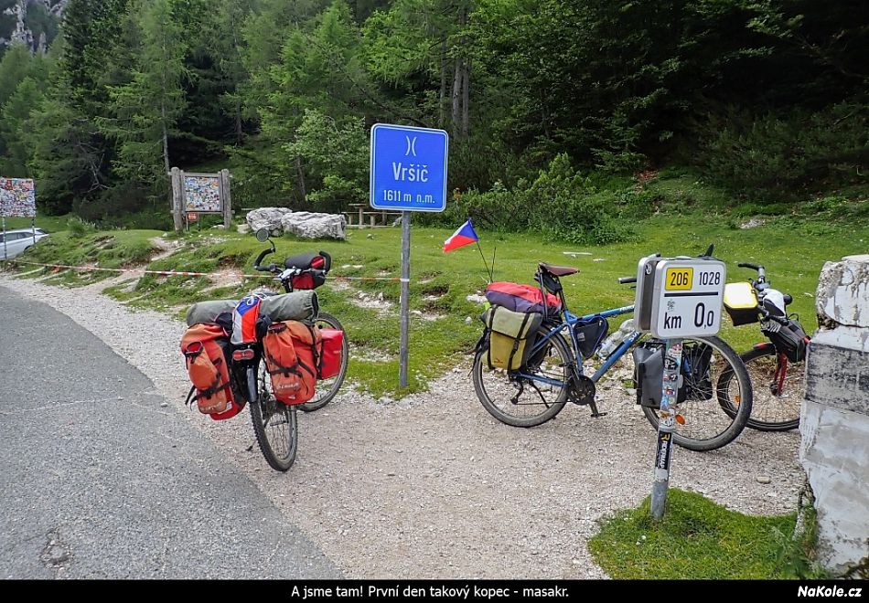 Dát si průsmyk Vršič (1611 m) hned první den nebyl úplně dobrej nápad, ale holt to tak vyšlo. Chtěla jsem hory, měla jsem hory. Návrat na tohle sedlo po 22 letech, tehdy jsme jej jeli od jihu a poslední den, nyní od severu a první den. Přišlo mi to horší, nebo jsme jen tehdy byli mladší? 800 metrů převýšení na 11 kilometrech. Masakr. Na prvních 5 kilometrech nastoupáte 200 metrů, to ještě šlo, nejhorší je ta druhá půlka. Mně to ale vůbec nejelo hned od začátku. A jakmile začala první z celkem pětadvaceti serpentin, měla jsem dost. Nechápala jsem, co se děje. Nohy absolutně nespolupracovaly. V jednu chvíli se mi i trochu zatočila hlava, až jsem musela sesednout a odpočívat. Rodina se podle hlášení z vysílaček pohybovala o 100 výškových metrů přede mnou a problémy žádné nepociťovali. Já jsem byla totálně v háji a nechápala, co se děje. Pravda, neměla jsem toho letos najeto moc, ale něco málo jo. Nebo že by to bylo o tom, že mi nedávno na věku naskočila číslice 5? Jako že by kondice takhle rychle šla dolů? Nebo je to něco jiného, o čem zatím nevím? Ano, takhle vážné jsem měla myšlenky při pokusu vyjet Vršič. Přece to nevzdám, říkala jsem si a dál střídala jízdu s tlačením kola. Do 1200 metrů k chatě Kuča na Gozdu jsem se dostala, ani nevím jak. Bylo pár minut po poledni, Luděk s Šárkou už seděli vevnitř. Svěřila jsem se s potížemi při výjezdu, ale jim to nijak náročné nepřišlo.