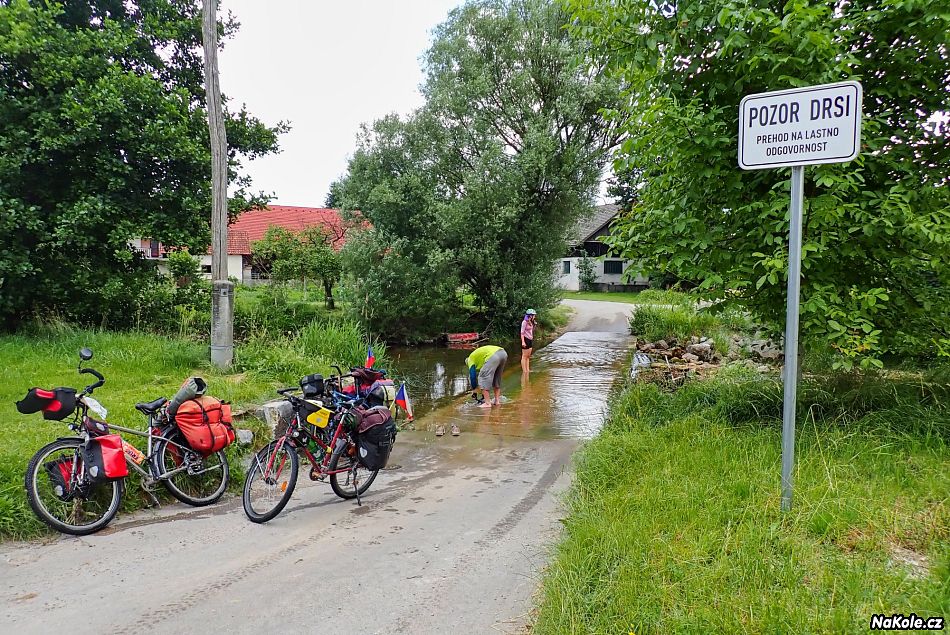 Černiško jezero zarostlé rákosím a za ním poslední úsek bez civilizace. I tlustá bílá silnice na mapě je v reálu makadamová. Dolenja Vas nečekaný brod řekou Vas, Luděk jede první. I když míjí varovnou ceduli „Pozor drsi", zradu žádnou nečeká. Jeho pláště jsou však poměrně úzké a kloužou, najednou se řítí k zemi. Ošklivě vypadající pád odneslo naštěstí jen zrcátko. Do báglů nenateklo.