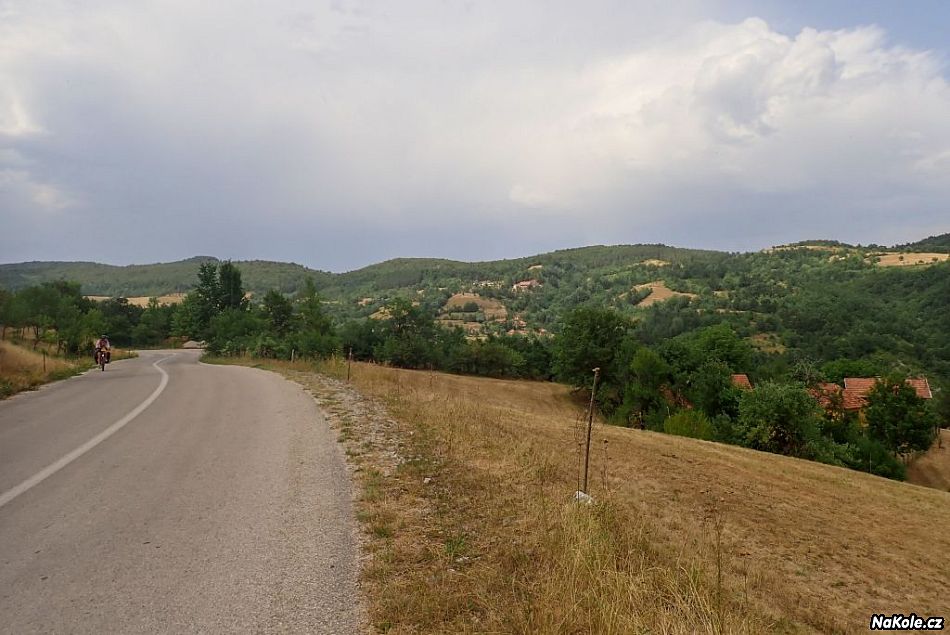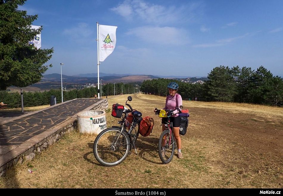 Ráno je hezky, ale vedro a jakési dusno, mají totiž přijít bouřky, což mě nepřekvapuje, bouřky si mě umí najít všude. První kopeček hned nad městem Šumatno brdo (1084 m) byl skoro zadarmo, na vrcholku památník partyzánům, kteří byli po pádu Užické republiky v roce 1941 chladnokrevně popraveni nacisty. Věděli jste, že existovala Užická republika? Já také ne. V dálce se zvedají nádherné holé kopce pohoří Zlatibor, mají 1300-1400 metrů a připomínají ukrajinské poloniny, jen nejsou teď v půlce léta zelené, ale spálené od slunce. Se Šárkou na ně smutně koukáme, hnedka bychom tam šly, ale máme kola a musíme se držet trasy a sjízdných cest.