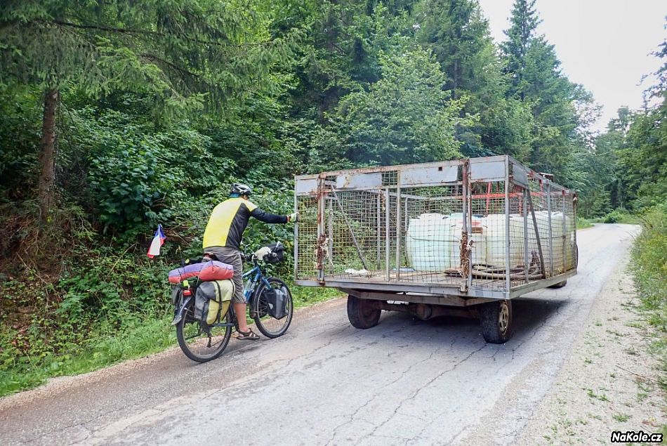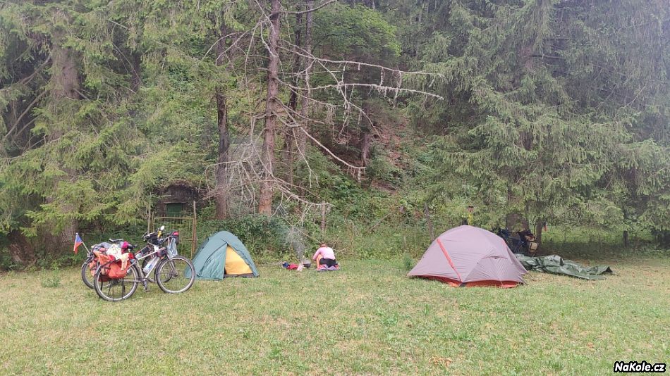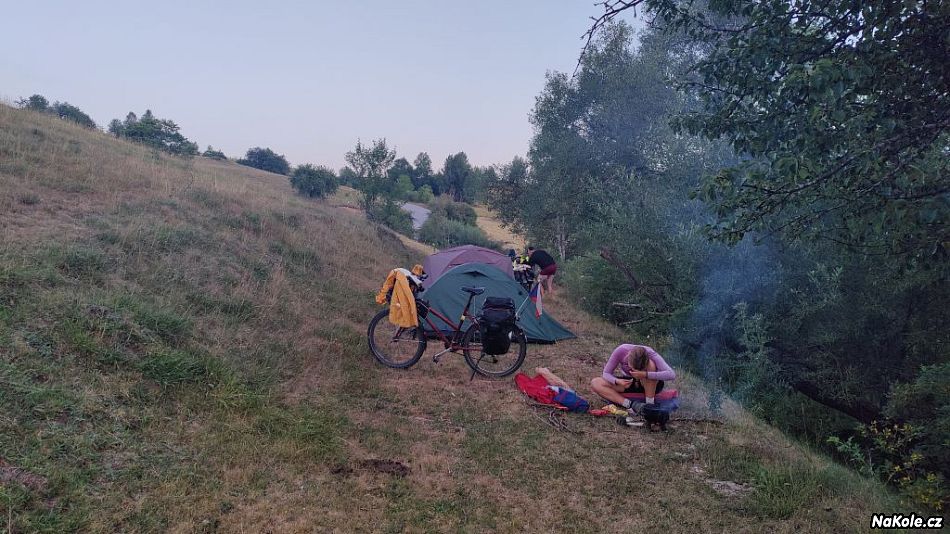 Poblíž parkoviště stojí jakási venkovská usedlost, tak jsme tam zašli pro s prosbou o vodu a zeptat se slušně na možnost noclehu na plácku mezi stromky pár set metrů od domu. Vodu jsme si nabrali ze studny a se stanem jsme čekali obligátní nema problema, ale tady prd. Pán byl starší a asi se bál, měli jsme tam přijít buď s koly, nebo se Šárkou, dítě budí důvěru. Ale měl na to svaté právo, tak jsme kola otočili a jeli pryč, krajinka kolem byla hodně přírodní, všude se pásly ovce a procházely kravky - to by bylo, abychom nocleh nenašli. Jenže jsme si naivně mysleli, že to už bude jenom z kopce, takže nás hodně zarazilo, když se silnice v jednom dolíku pouze zhoupla a zamířila nemilosrdně vzhůru, dobrých deset dvanáct procent. Dole jsme přibrzdili, tak to už dneska fakt ne! Frkli jsme to na loučku hned vedle, trochu nadrzo, krytí jen nízkými keříky, ale po té silnici skoro nikdo nejezdil, a když, tak měl plné ruce práce s volantem, natož aby koukal po tom, jestli tam někdo nestanuje. Těch pouhých 55 kilometrů bylo dnes hodně výživných, kamení a kopce.