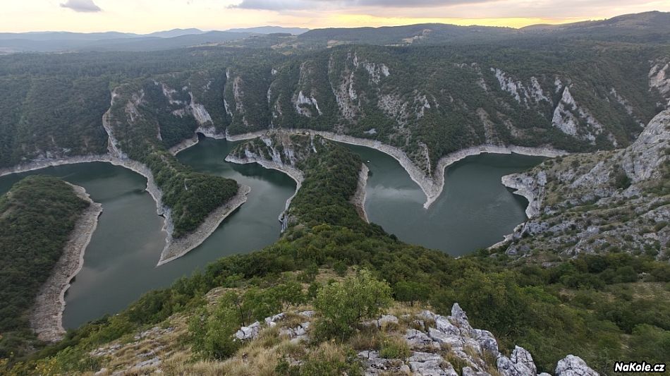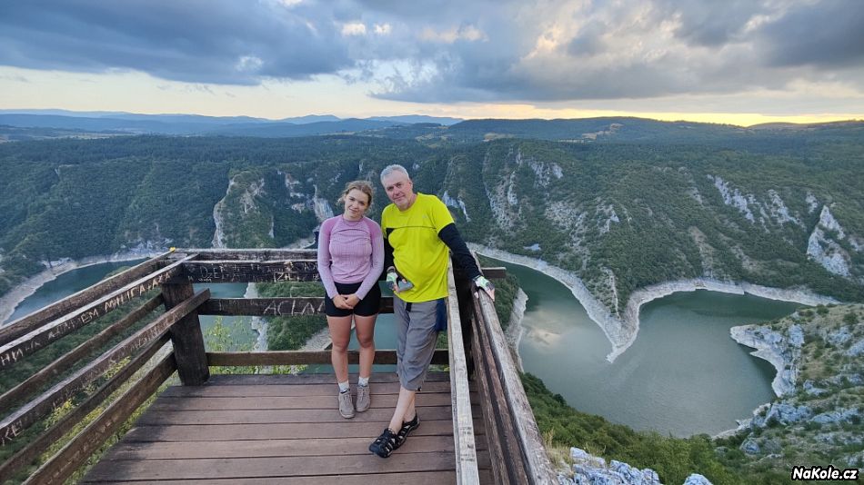 K vyhlídce Molitva na kaňon řeky Uvac jsme nakonec dojeli takovou super horskou krajinou ještě za světla. V okolních obcích trčely k nebi bílé štíhlé věže minaretů (už jsem zapomněla, že i v Srbsku existují muslimské oblasti) ještě za světla. Od parkoviště se teda musí kousek pěšky, ale je to parádní, Luděk a Šárka byli překvapení, netušili, proč celý den jedeme po těch blbých kamenitých cestách, ale bohužel sem žádná lepší cesta nevede. Koukali jsme, jak se pod námi klikatí řeka a vytváří neuvěřitelné. Mezitím slunce zapadlo, a přiblížila se otázka, co s noclehem.