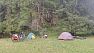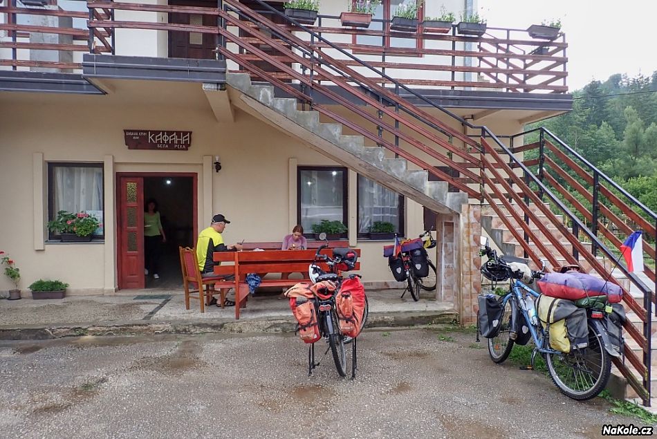 Vedlo to do kopce a pak z něho dolů a v dolíku se krčila vesnička s krámkem a kafanou (Gornja Bela reka) a takovou tou klasickou balkánskou atmosférou. A hlavně, z toho dolíčku, v cca 900 m n. m., silnice pak hned okamžitě stoupala zase do 1300, a na noc hlásili bouřky, tam jsem řekla, že končíme, i když jsme měli jen necelých 60 kilometrů. Řeku jsme přejeli po takové provizorní lávce a utábořili se na louce za ní, reálně v centru té vesnice, ale ono to bylo jen pár roztahaných domků podél silnice. Šárka nezklamala a jako vloni se ujala vaření, já postavila stan. Stany jsme zase vezli dva, tentokrát měl taťka ale plnohodnotný, nechtěl si zopakovat zážitek z loňska, kdy sháněl ve Slovinsku moskytiéru kvůli komárům.