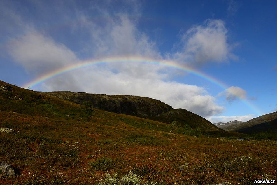 Protože nás od rána provázel mírný deštík, takový ten sice snesitelný, zato intenzivní a dlouho trvající, překvapilo nás objevení se duhy. Duha přece vznikne jen v kombinaci se slunečním svitem, ne? A slunce jsme rozhodně nikde neviděli, zůstávalo skryto za černými mraky. Každopádně duha měla pozitivní efekt. Ne, nenašli jsme na jejím konci poklad, nýbrž stezku, na níž se prakticky nevyskytovaly kameny. Skutečně! Prostě terén téměř bez šutrů. Nádhera. Nás o tomto faktu informovali turisté ze srubu Kuonjarjoki, kde jsme tuto noc spali. My jim to vůbec nevěřili, bylo to ale tak. Opravdu dnešní etapa měla výskyt balvanů asi jako na Tatranské magistrále, což bylo na zdejší podmínky naprosto zanedbatelné.