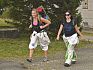 Do hospůdky jsem nešel, vzhledem k pěknému počasí sedělo na venkovních lavicích plno lidí včetně cyklistů, kteří určitě vyjeli až nahoru v sedle (...), pro zdatnější jezdce než jsem já jsou zde i závody, jeden z nich je součástí BIKESERIÁLU ČESKÉHO LESA, koukněte se na web závodu zde. Do areálu přicházeli další a další turisté, vynikala mezi nimi skupinka mladých, navlečených do jakýchsi kombinéz z netkané textilie na záhony, na vlajce z prostěradla měli heslo AKU-PUNK-TŮRA, trousili se po dvojicích a trojicích a vrhali se rovnou k občerstvení na polévku, nahoře bylo fajn, ale taky byl čas k návratu. Nasadil jsem helmu (celou dobu cesty nahoru jsem ji měl pověšenou na řídítkách, že bych spadnul při chůzi příliš nehrozilo), natáhl rukavice, foťák jsem dal do batůžku na záda, aby čip při jízdě po panelech nezkolaboval a odpíchl se z prostoru čechovských věží.