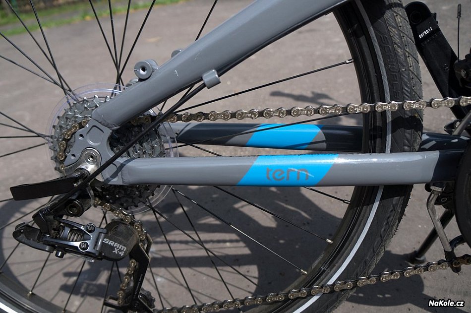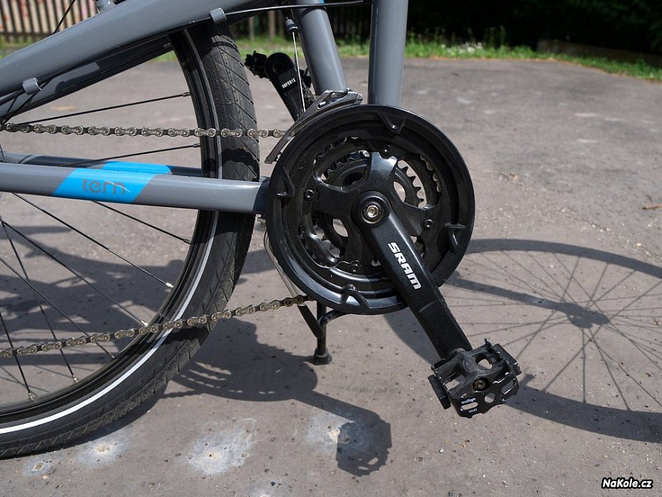 Osazení odpovídá kategorii – přehazovačka SRAM X4 s grip shifterem stejné značky se starají o obsluhu 8 kolečkové kazety Sunrace. Trojpřevodník Microshift je ovládán rovněž grip shifterem, který nám ulpěl v paměti jedním (možná jen pro nás) zajímavým rysem, a sice tím, že nemá pouze tři polohy, jak by člověk předpokládal podle počtu převodů. Krok řadiče je tak nějak delší, takže přeřazením o jeden stupeň vlastně přeřadíte jenom o půl stupně. Oproti klasickým páčkám je to sice trochu nezvyk, ale dá se s tím žít. Rozsah 24 převodů je naprosto dostačující. Véčkové brzy, jejichž výrobce nám Tern zatajil (na webu se píše „V, aluminum, linear spring“), se chovají zhruba tak, jak byste od nich čekali – prostě brzdí. Sedlo (opět se všeříkajícím názvem „Sport“) ve skutečnosti není úplně sportovní, ale pro daný účel příjemné. Kolo je, nebo alespoň to naše bylo, standardně osazeno stojánkem, ne však už blatníky – ty si musíte případně přikoupit. Možné je osadit i nosič – ani ten ale ve standardní výbavě nehledejte.