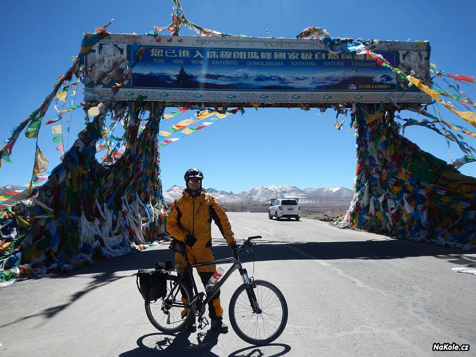 Předjíždíme čínského cyklistu, který na rozdíl od nás putuje „na těžko“. Silnice vytrvale stoupá a kyslíku ubývá. Ke konci se už silnice jen kroutí ze strany na stranu a vršek průsmyku se zdá nekonečně daleko. Kvůli kašli – následek dýchání pusou v důsledku nosu ucpaného krvácením – se mi špatně dýchá, a tak výjimečně přenechávám tuto horskou prémii dánskému maratonci Torbenovi a dorážím pár minut po něm. V této výšce je už poměrně citelná zima, tak rychle teplý džus z doprovodného auta, na sebe goretexy, udělat fotku a hurá dolů. Celkem významnou motivací je vidina studeného piva a teplé sprchy v hotelu ve městě Xegar, kde končí dnešní etapa. Kvůli mnoha zastávkám na jídlo a hlavně na focení dorážíme do města nastejno s čínským cyklistou.