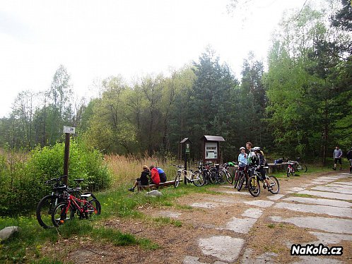 Cyklisté u rozcestí na hrázi rybníku Držník