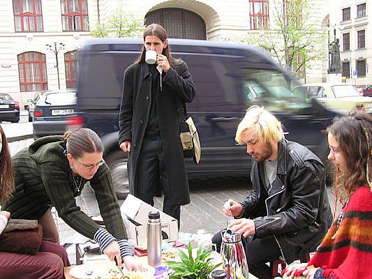 Na Mariánské náměstí dorážím s mírným zpožděním. Na jednom z parkovacích míst už z dálky vidím pestrobarevnou společnost – cyklisté v reflexních vestách, mladí studenti a novináři s kamerami a fotoaparáty. Všichni stojí nebo sedí okolo provizorního stolu, který je vytvořený z desky upevněné na přívěsném vozíku za kolo. Ubrus je pokrytý bohatým švédským stolem – hrnky s kávou, koláče, müsli, ovoce, bábovka… Všichni si užívají krásného rána jako by seděli doma u svého stolu. Snad jenom s tím rozdílem, že všude kolem kam oko dohlédne stojí auta.