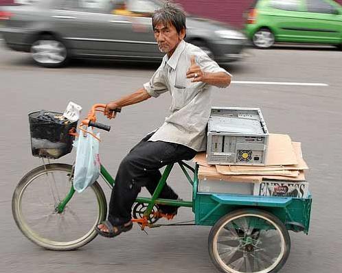 Ani tohle není jen tak obyčejný náklad. To, co pyšně trůní vpředu je mixér – jak jinak, než na šlapací pohon.