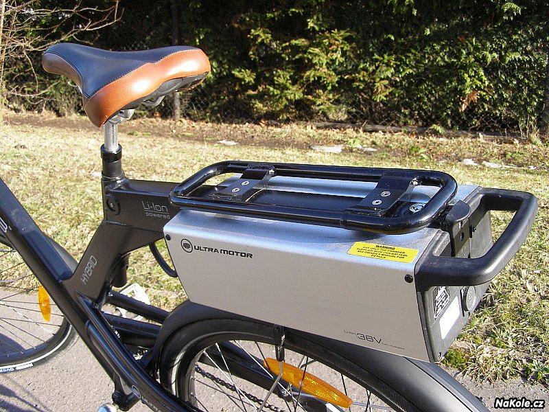 Další částí, která si zaslouží komentář, je nosič. Protože je výrazně užší než baterie samotná a k baterii se velmi těsně přimyká, nelze na něj připevnit prakticky žádné standardní brašny na kolo. Tento nosič je určen pouze pro připevnění košíků, které jsou v nabídce příslušenství firmy Ultra Motor. Pro připevnění brašen na kolo je nutné pořídit si nosič z nabídky Ultra Motor.