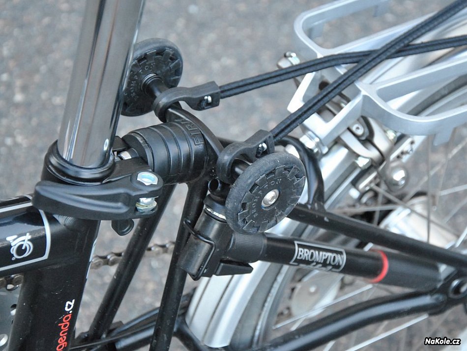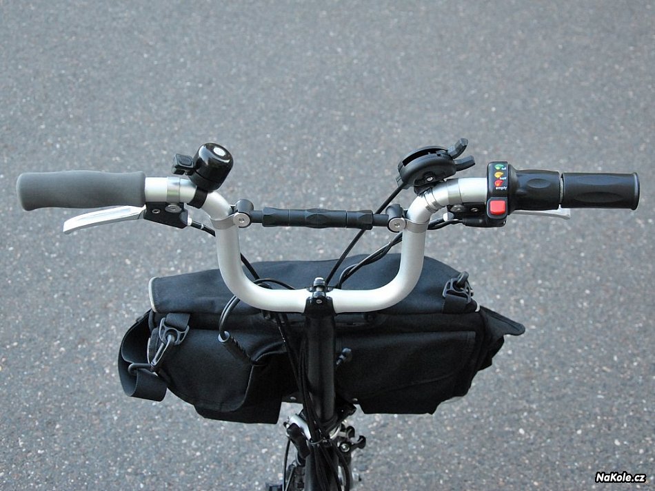 Před složením kola je potřeba odpojit kabel vedoucí k baterii a sejmout brašnu. Skládání pak probíhá standardním „Bromptoním“ způsobem. Výhodou tohoto řešení je možnost elektropohon (pochopitelně kromě motoru) sejmout a snížit tak váhu kola. Přitom brašna je i po umístění baterie a řídící jednotky v podstatě prázdná, takže do ní bez problémů naskládáte třeba notebook se zdrojem a pořád ještě nějaké místo zbude.
