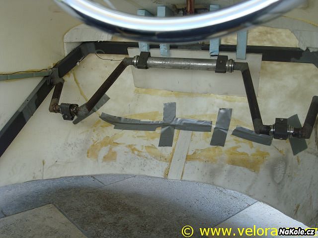 Kardan tam vpredu je a ten volant tusim visi na elektrikarskem skrku shodou okolnosti vpravo. Kam si ho povesis je tvoje vec, rizene je predni kolo a hnane je prave zadni ktere ma max zateze. Ridit me to nenechal, ale svezl me jako spolujezdce (spolu-slapace) a bylo super. Je to odvozene od jeho singl stroje stejne koncepce jen z carbonu, povazovane za nejlehci velomobil sveta, protoze ten cely vazi 12kg. Ze Spezi 2009, kde ho mel, mam fotky jak to cele drzi nad hlavou :-)