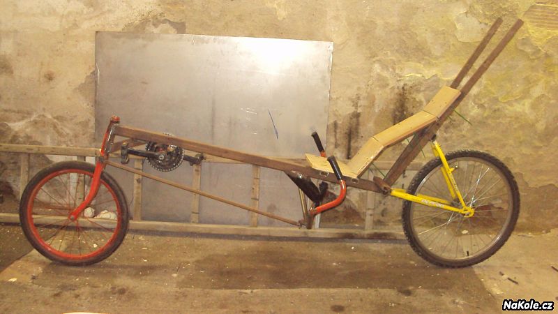 No já už dlouho pokukoval po něčem jiným, než zábradlí. Na tom jsem měl problémy se zádama a sedinkou. Už dlouho sleduju všelijaký stránky o lehokolech. Fčil mi doktor doporučil cvičit na nohy, tak kolo jsem zavrhnul hned. Na koupi lehátka nemám a považuju se za kutila, tak jsem se pustil do stavby, bo jsem ještě nevěděl, jak se na tom vůbec sedí a jestli to vůbec půjde. Proto jsem chtěl jen za minimální cenu něco, na čem to můžu vyzkoušet. Zatím jen provizorně jen se základním vybavením, aby to jelo a brzdilo. Předevčírem jsem poprvé sednul na lehátko, hned před garáží po nasednutí a prvním našlápnutí lehnul na zem. Strašně jsem se začal řehtat! Hned, jsem to dotlačil o pár ulic vedle na rovinku, kde nejezdí moc aut a šel zkoušet. Už jsem hapal jen jednou při prvním otáčeníse na konci ulice. Okamžitě jsem prohlásil, že obyčejný kolo už ne e! Je to paráda! Včera jsem se byl projet už rovnou z domu, takže po veřejný komunikaci a z5. Vyjel jsem a hned plno policajtů. Čuměli, jak černoch na zamrzlej kýbl! Za rohem najednou kupa praporčíků a řvali na mě "makej, seš první!" Já trošku nevědíc o co jde pokračoval. U další křižovatky další a hulákali abych valil do prava na náměstí a já že ne, já jedu za ségrou! "Ty vole, vždyť to vedeš!"Halekal další! Za rohem jsem zastavil a koukám, najednou se vyrojilo stádo byciklistů, jel se závod Brno Velká Bíteš. Tak jsem mohl vyhrát... Jelikož bydlím v kopci, tak jsem cestou domů zkusil i kopeček. Ten mi dal! :-) Jediný, co cejtím, tak nožičky, hlavně kolena, ale vzhledem k tomu, že jsem na kole neseděl asi tak 5 let a před tím taky žádná sláva, tak to bude hlavní důvod. Dnes jsem namontoval ještě sedačku pro synka a už jsem si i s ním troufnul na okružní jízdu kolem města. Doprovázela nás dcerka na obyč kole. Projížďka super! Malej koukal, a líbilo se mu, že vidí na cestu! Tak mě teď čeká komplet rozborka, trochu to obrousím, doladím některý věci a nalakuju, aby to trošku vypadalo a můžu pomalu razit. Fčilkaj už jen zvyknout ty fajfky na šlapání a bude to good! V hlavě už se rodí další nápady na další stroj. Jenže co s tímto? No to je ještě daleko!
