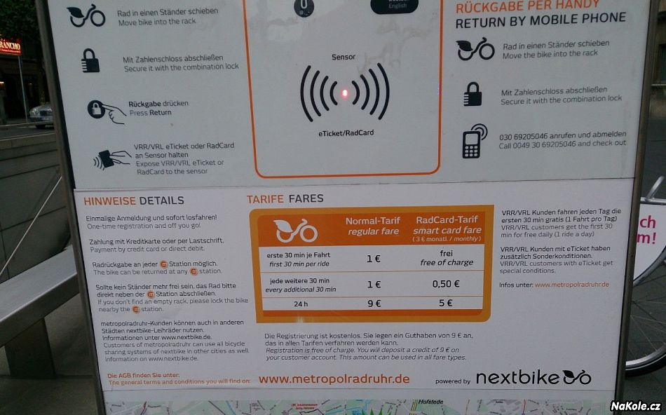 Moc jsem nepochopil, jako tohle mají ti kluci ošetřený, myslím si že v té Bochumi se přihlašuješ a po odevzdání zase odhlašuješ mobilem, takže asi také vědí, kdo měl kolo naposledy, a zase, zamyká se do stojanů, ale už zdaleka ne tak brutálně jako ve Francii nebo Itálii.