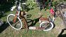 Dcery na odrazadle(na obrazku odrazadlo v 110cm dlzke a riadenie v 60stupnovom uhle)- zboznuju tie jazdy. Na nich som testoval rozne sklony. Samozrejme ze aj na sebe, ale je lepsie ked mam viac nazorov, pretoze som zistil, ze nemam problem jazdit aj s negativnym trailom a ani som si to nevsimol. Dcery si to vsimli pre otacani sa. Ja by som si to mozno vsimol az pri takej rychlosti pri ktorej by som neudrzal riadenie v rukach :) Nulovy trail bol o drzku. Riadenie strasne citlive. Ziadny pokles predku pre zatacani, lenze ani ziadne snahy o vybratie zakruty. Pri negativnom traile sa to centruje samo aj pri nulovej rychlosti, no pri jazde a naklone do zakruty sa koleso snazi zmensit uhol otocenia riadenia. Pokial sa ale clovek do zakruty nenakloni bicyklom, ale len na sedacke telom... Veru vela sme skusali :)
