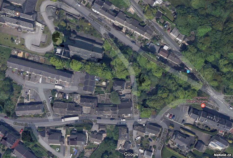 Uvíz někde uprostřed, ta ulička je dlouhá ani ne 80m. Z jedný strany hřbitov, z druhý kostel. :-) Musely se pak dělat nějaký zednický práce, ježek z klece taky nejde na provní pokus. Chlapec se asi prohnul. Ta Church st. stoupá yleva doprava taky asi s 10%, takový blbý místo si vybral s velkejma stromama.