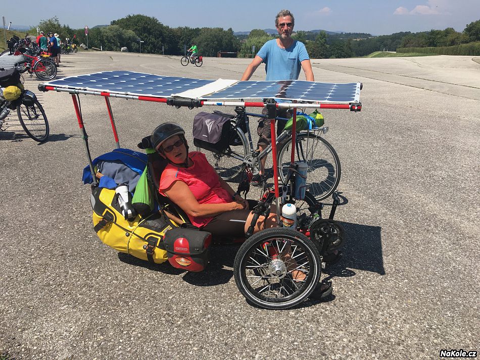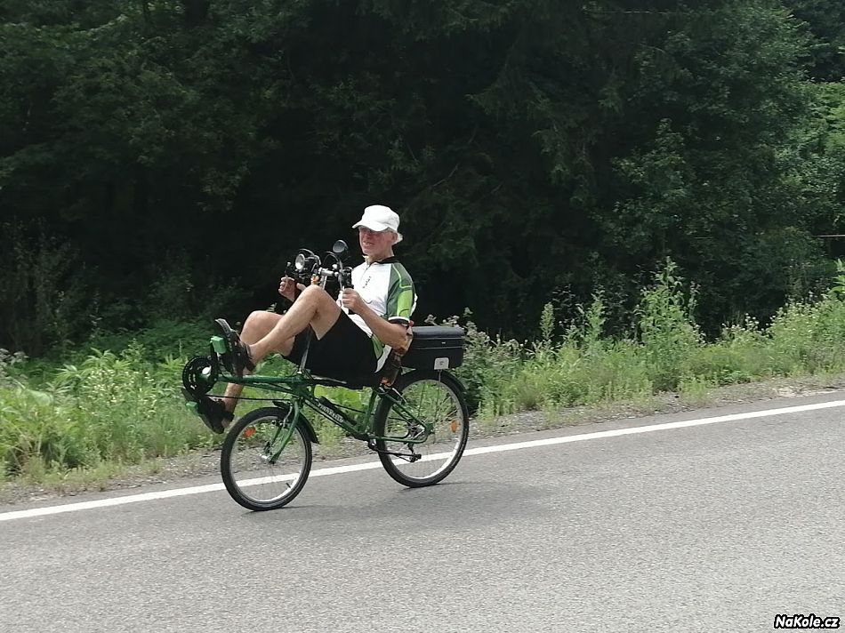 Ve středu další tříkolkář na silnici podél Jizery mezi Ml. Boleslaví a Bakovem. Jiný, s bílým blembákem na hlavě a českou vlaječkou.