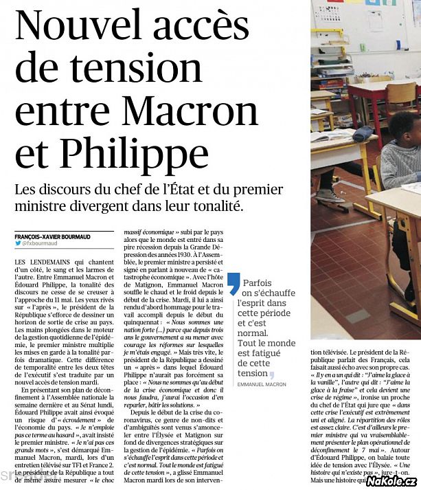 „Je tu jeden, co říká: mám rád vanilkovou zmrzlinu, a druhý co říká: mám rád jahodovou zmrzlinu“ a tak vznikne krize v dietě“ ironizuje jeden blízký hlavě státu, který soudí: „v této krizi je exekutiva výjimečně jednotná a vyrovnaná. Rozdělení úloh je dostatečně jasné. Je to také premiér, který pravděpodobně představí operační plán rušení omezení pohybu dne 7. května“. Okolí Éduarda Phlippe zametá pod koberec všechny myšlenky na napětí s Elysejemi: