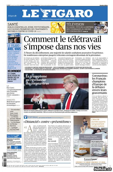 Tedy Komise dnes přestaví plán. Le Parisien na titulní straně řeší problém s ukončením fotbalové ligy, Le Figaro se tomuhle věnuje ne str. 25, Le Monde vůbec, oproti tomu belgický Le Soir, viz obrázky.