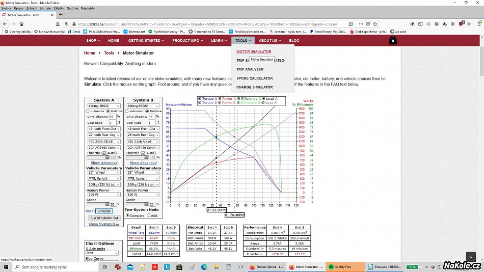 Pro motory BBS02 a BBSHD je k dispozici Simulator Grin, na kterém je možno simulovat různé situace. Příklady i pro přehřátí motoru BBS02:20A/48V, plný plyn, 20% stoupání,100 W cyklista a různé převody s kadencí 55 (system A) a 77(system B). Ze simulace plyne, že k přehřátí dojde po 5 min. (A) , nebo po 19 min(B). BBSHD se za podminek A (nízká kadence) přehřeje za dvojnásobnou dobu, než BBS02-asi 10 min.Pokud se udržuje rozumná kadence pedálů např. 70 RPM, vydrží motory bez přehřátí delší dobu. Pro BBS02 je to asi 12 min a pro BBSHD (také 20 A) je to 29 min.