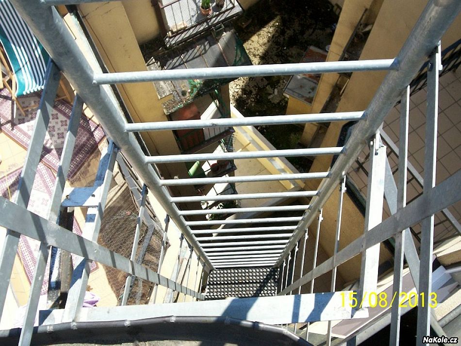 No a pak jsou občas zajímavé specialitky, jako např. v Divadelní ulici za Novou Scénou. Tam se jde po schodech do 5. patra. V 5. patře na podestě se otevře okno a vystoupí se volně do prostoru dvora :-)) Ve fasádě je vetknutý ocelový žebřík, začíná v tom 5. patře, leze se po něm zády k fasádě a obličejem do prostoru.