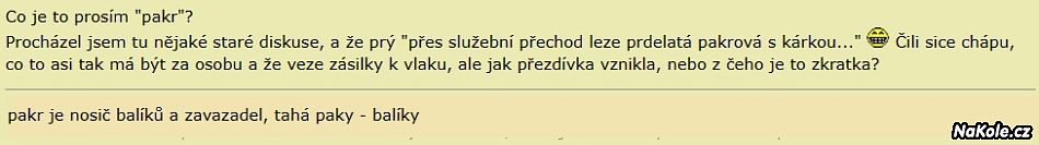 Občas nahlížím na K-report, což je diskusní server o hromadné dopravě. Tam jsem našel pojem pakr ve větě "Rychlík mizí v dáli a po prázdném nástupišti se potácí pakrová s kárkou".