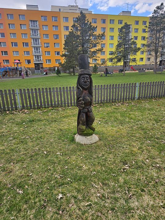 jeden vodník z umělého kamene sedí před dětským hřištěm v obci Pravy