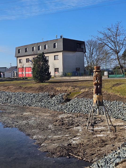 další dřevěný vodník hlídá požarní nádrž ve Veltrubech