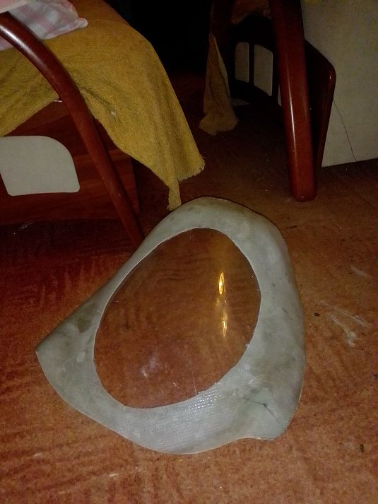 To sklo bude nejspíš jiné, než jsem tam načrtnul. Takovéhle, jako na fotce je na tom původním deklu, přilepené zevnitř silikonem - napevno. A za deště by přes něj dozajista nebylo vidět. takže asi něco jakoby otevíracího motorkářského, což už se na dnešních velomobilech stalo v podstatě standardem. Ale mně se ten původní dekl s pevným sklem prostě nějak líbí. Je z něj dobrý výhled. Jen je možná nepraktický...ale já právě nevím, jestli je nepraktický, protože, ač jsem výše psal "dozajista nebude vidět" tak to vlastně nemám ničím podložené. Takhle vypadá ten původní dekl :