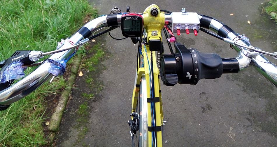 Hodně záleží na tom, kde je osa řízení. Na pythonu ji mám pod zadkem, takže stačí tlačit zabírající nohou malinko šikmo ven, tím se momenty vykompenzují a ruce vůbec nepotřebuju. To nové kolo ji má až někde před koleny, úhel síly pro úplnou kompenzaci je moc velký. Kombinuju plynulé frekvenční šlapání menší silou, šikmý tlak zabírající nohou ven a druhou dovnitř a co zbyde, to musí pobrat ruce. S těmi superširokými řidítky kupodivu většinou vyhrávají.