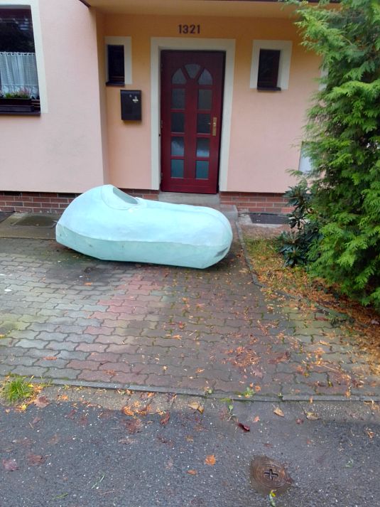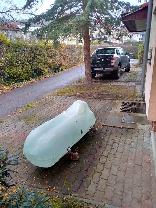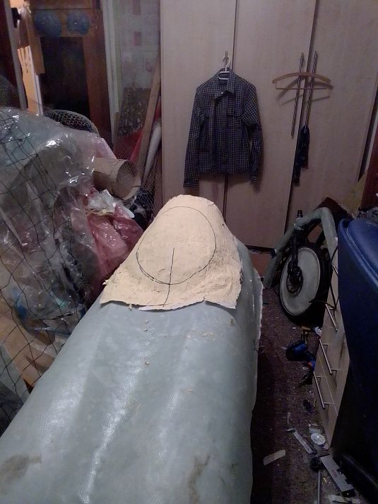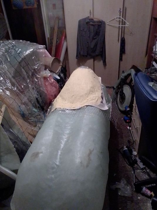 Celkem se mi podařilo vytvořit polotovar prototypu trupu toho streamlineru co už dlouhou dobu dávám dohromady. Drobnému škobrtnutí, které se na chvíli změnilo ve strmý pád jsem se ale nevyhnul. Špatně jsem totiž odměřil svinstva a následně jsem ztratil přehled o tom, kolik tam kterého svinstva vlastně je. Takže jsem ztratil i při laminaci velmi cenný čas. Další problém byly nejasné okraje kopyta (použil jsem pro oba výlisky jedno kopyto). Které jsem si prostě nedostatečně vytyčil. Takže další ztráta času. No a svinstva mezitím už začala reagovat, takže jsem dobré kilo odepsal. Nedá se nic dělat. Ale jinak to vypadá jako to, co to má být a tím nemyslím falus. Myslím velomobil. Ještě se to musí nějak spojit dohromady. Ještě nejsem rozhodnutý, jestli permanentně nebo rozebíratelně.