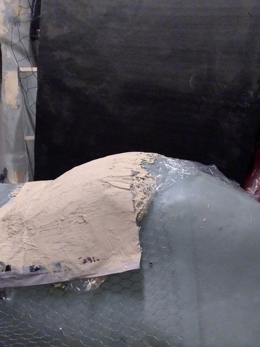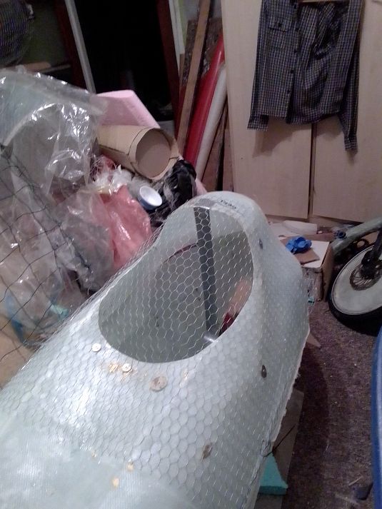 Dost mi vadil přechod předního skla do střechy - byl strašně ostrý. Znamená to předělání celého deklu pro vlez. Zkoušel jsem díru pro vlez překrýt folií a na to dát napuštěnou tkaninu ale pořád se to propadalo a ani ten přechod deklu ve střechu nebyl žádný zázrak. Na recumbents.com nějaký maník píše o použití chovatelského pletiva a tmelu Bondo, který se na pletivo napatlá a dá se takhle velmi lehce docílit komplexních křivek. On tam s tím dělal tailbox. No jo, jenže u nás se Bondo neprodává. Polyesterový tmel se skelným vláknem ale jo. Pletivo jsem už měl, koupil jsem tedy ještě tmel. Pletivo jsem pár vruty s velkými podložkami uchytil přes vlez a pak jsem ho vymodeloval do potřebného tvaru. Pak jsem tam chtěl dát ten tmel, ale on prostě propadl skrz a vznikly takové halušky. Tak jsem tam dal folii a tmel pak na ní. Ty noviny tam být už asi nemusely, no nic. Pak jsem to natáhl ještě normálním tmelem, abych se mohl na tvar podívat nerušen textem a fotkami v novinách.