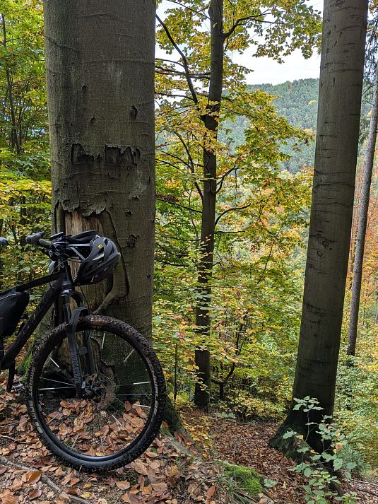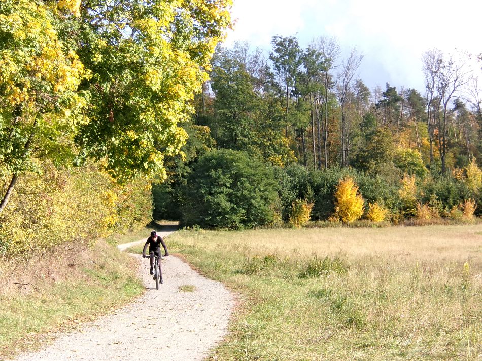 Předpověď mi ovšem zatajila, že ráno bude v Chocni a okolí docela slušně pršet. Jak jsem přijížděl autem k Chocni, tak kaluže nebyly moc přívětivé. Sedl jsem na kolo a vjel do lesů. Pěšiny a zvlášť ty zatravněné a plné jehličí se daly ždímat, ale moc to neklouzalo, tak jsem věřil, že se to bude časem zlepšovat a také ano, docela rychle cesty a pěšiny vysychaly a za hodinu už to pod koly nečvachtalo a po poledni příjemné teplo a sluníčko a na i na lehké podzimní oblečení docela teplo a už téměř úplné sucho.