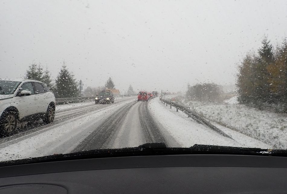 Stačilo vystoupat pár metrů nad Jáchymov a počasí se rychle zhoršovalo. A kousek před kruháčem na Klínovec konečná - zjevně se někdo pokusil přejet sedlo s letními pneumatikami a neprojel...