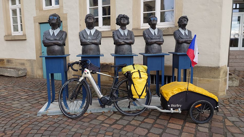 Nemá mě co překvapit, snad kromě uzavřeného železničního přejezdu kousek za Heilbronnem, ale objížďka nebyla dlouhá a zpátky na trase k tomu sousoší v městecku Güglingen, u kterého svá kola fotím.