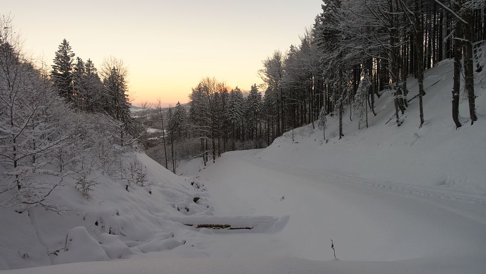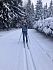 Máš tam: "Už bychom měli začít", tak jsem "začal" prošlapávat stopu od baráku na golfové hřiště, kde po obvodu lesa vždy bývaly běžkařské stopy. Ražení nebylo nic moc, i když těch cca 15cm sněhu byl prašan. Pak jsem narazil na místo, kde už mě někdo předešel, a tak jsem se mohl i trochu sklouznout. Takže už to bylo "radování".