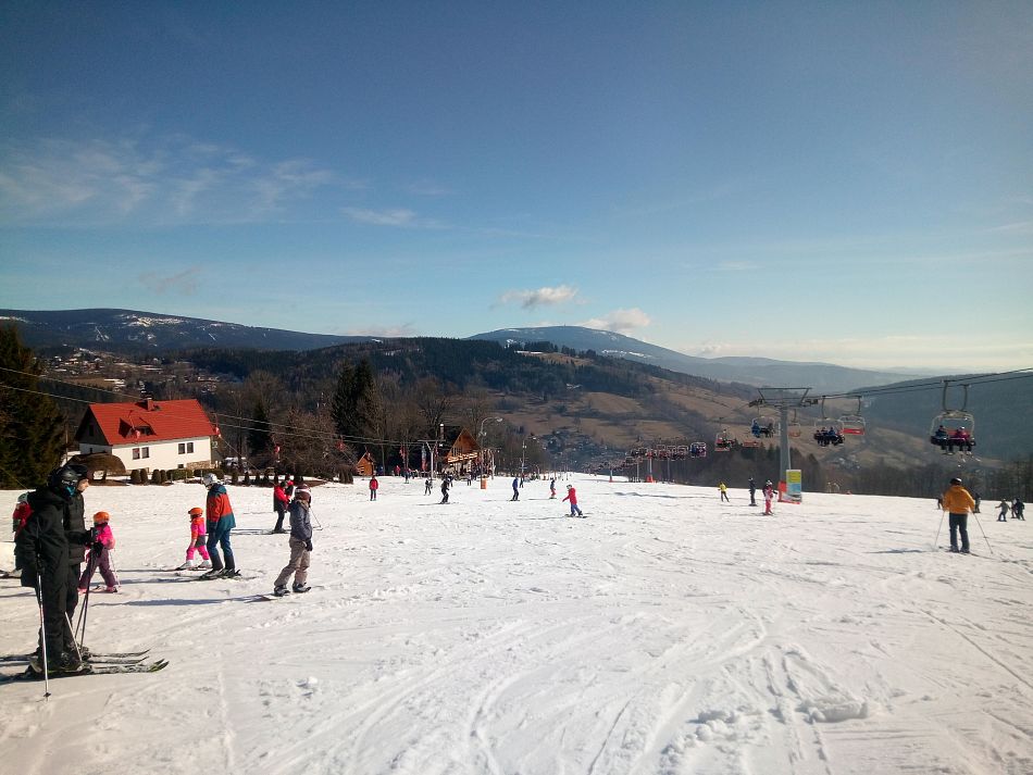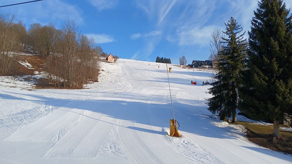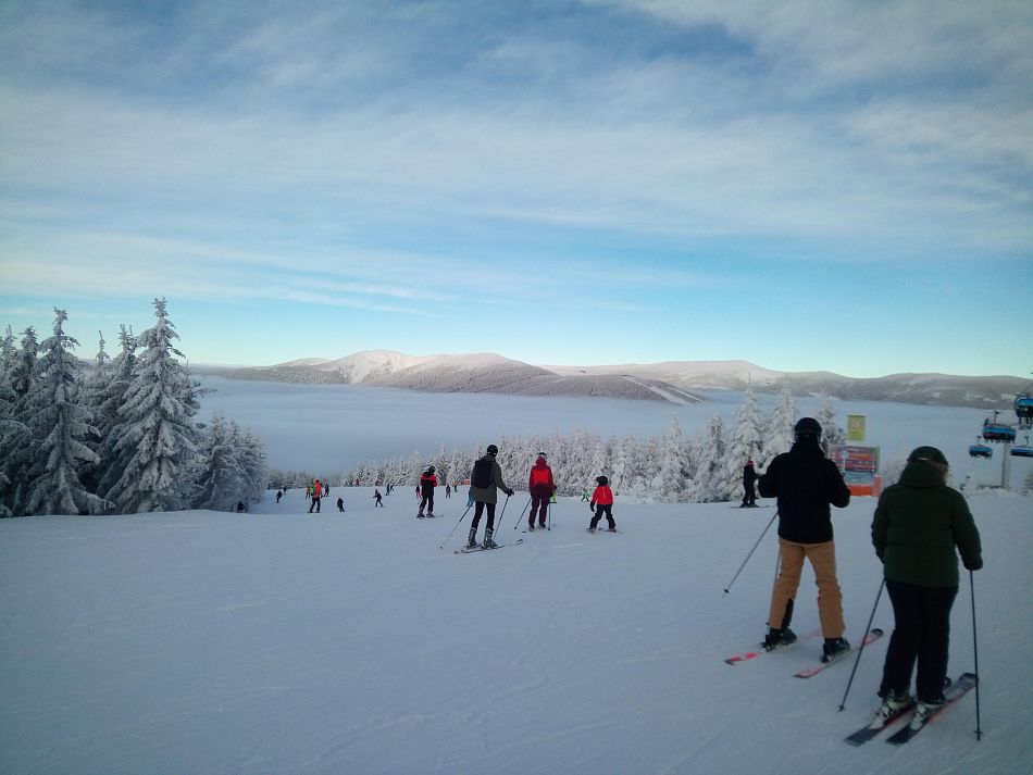 Dnes jsme kroužili v čerstvě najetých stopách u Hvězdy. Ráno jsme z parkoviště v Příchovicích viděli rolbu, upravili v podstatě všechny obvyklé trasy v tom místě. Bylo chladněji než včera a s větrem a vyjasněním byla pocitová teplota pod minus 10. Lidí k poledni přibývalo, u horních stanic lanovek plno sjezdařů.