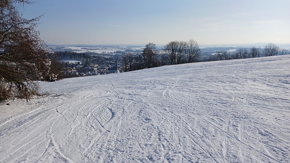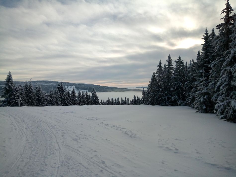 Dnes první sjezdovky v domácím areálu. Bubák to se sněžením dokázal nejlépe. Krásné lyžování, slunce, málo lidí. Jen ten pohled mimo sjezdovku je nezvyklý.