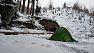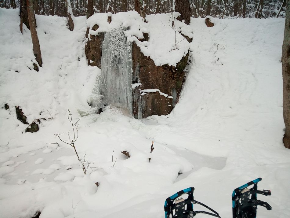 Mlha a chumelení mě dnes na lyže nelákaly.Tak jsem si vyšel na sněžnicích opuštěnou krajinou a prohlédnout si zamrzlý vodopád. A vypadal moc hezky.