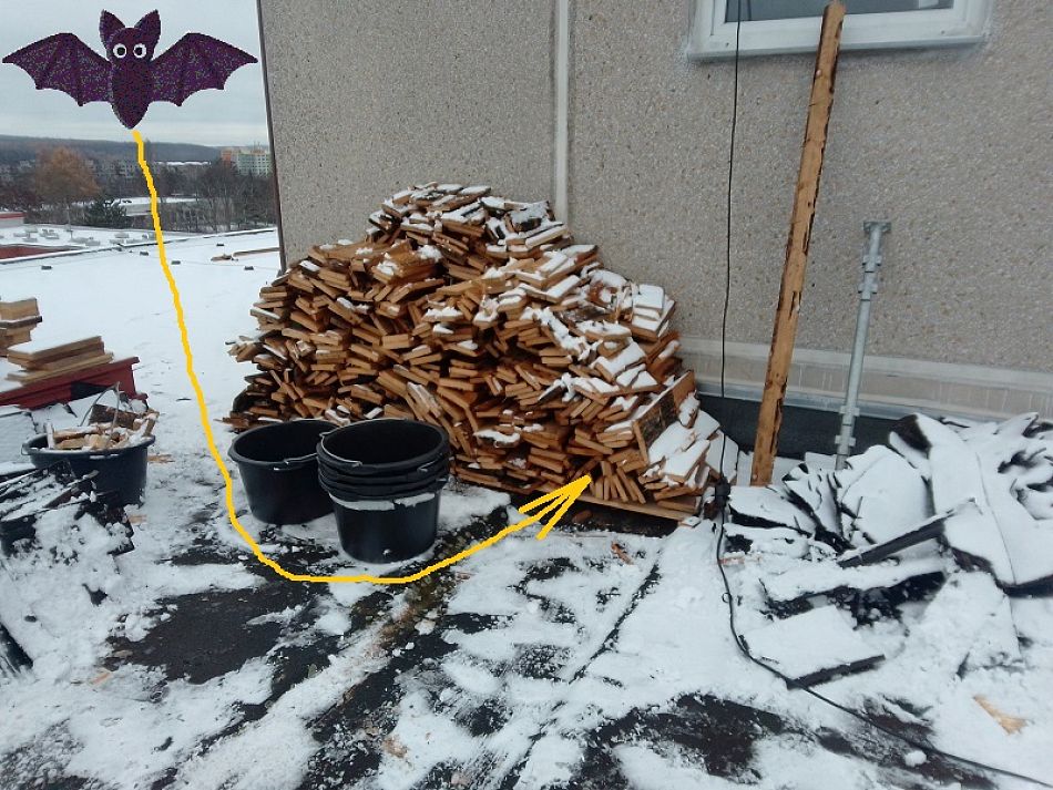 Na ploché střeše paneláku mám několik týdnů uloženou hromadu starých vybouraných prken, určenou k odvozu. Když jsem nyní prkna nakládal, našel jsem mezi nimi malého netopýrka. Ten si tedy zimoviště vybral pekelně špatně! Byl napůl zmrzlý, skoro se nehýbal. Štěstí, že jsem si ho včas všiml, bral jsem ta prkna po náručích, také jsem ho mohl ošklivě pomačkat.