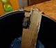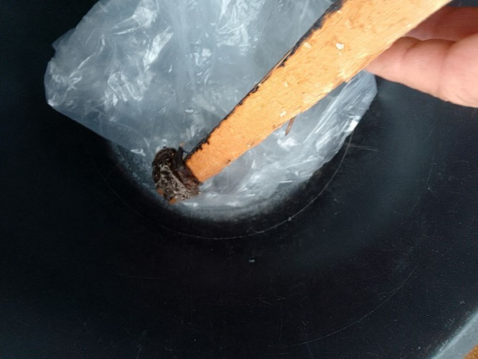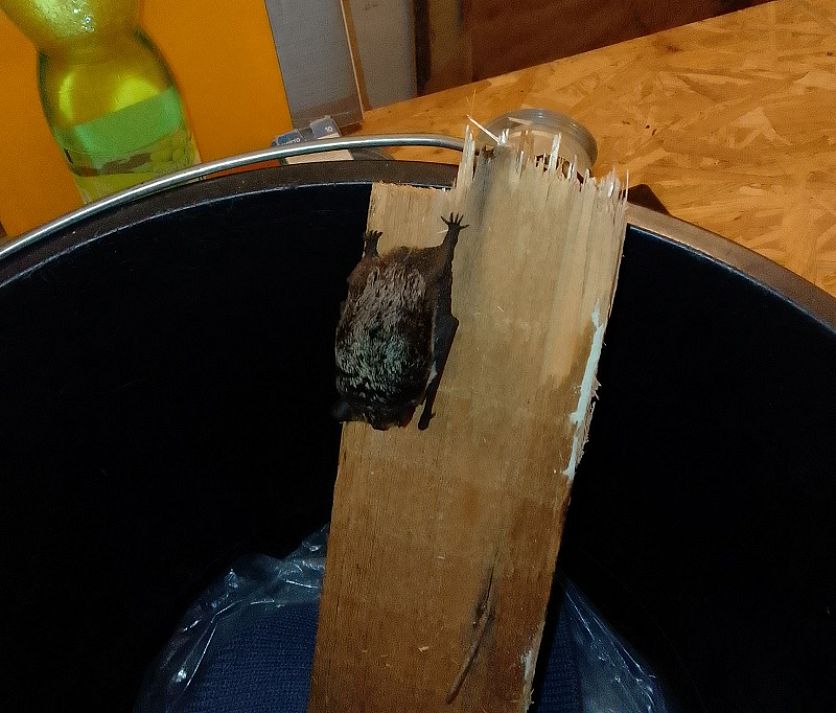 V rámci první pomoci byl netopýrek přemístěn do kyblíku a odnesen do teplého sklepa, kterým prochází trubky ústředního topení. Ani za nic se při tom nechtěl pustit prkénka, na kterém jsem ho našel. To prkénko je prostě jeho a to on nikomu nedá!
